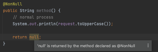 항상 Null Check를 수행하도록 경고할 수 있는 어노테이션이다.